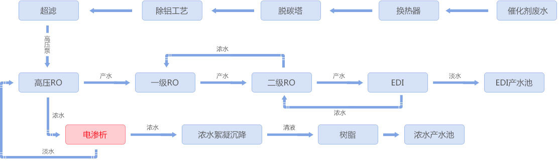 稀土氧化物催化劑生產(chǎn)過程中會(huì)產(chǎn)生大量3-5%硝酸鈉廢水,采用均相膜電滲析裝置將硝酸鈉濃縮到20%以上進(jìn)入蒸發(fā)系統(tǒng),淡水經(jīng)反滲透處理后回用。該均相膜電滲析產(chǎn)品解決了異相膜和部分進(jìn)口均相膜濃縮倍數(shù)不高、不耐金屬離子污染的問題,同時(shí)實(shí)現(xiàn)含硝酸鈉廢水零排放及資源化利用。