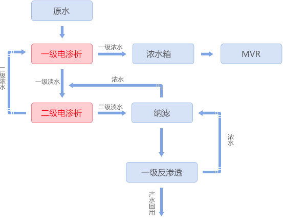 氧氯化鋯和碳酸鋯生產(chǎn)工藝產(chǎn)生的高含鹽廢水,采用均相膜電滲析裝置和反滲透耦合聯(lián)用,對(duì)該高鹽廢水進(jìn)行處理,可將鹽水濃縮到18%以上進(jìn)MVR蒸發(fā),淡水經(jīng)反滲透制得純水回用,解決了高鹽水的排放問題。