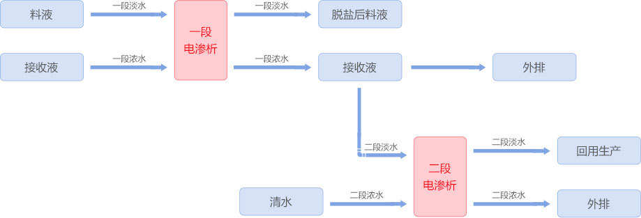 高鹽高COD廢水中無(wú)機(jī)鹽含量過高對(duì)微生物具有強(qiáng)抑制和毒害作用,難以采用生化法處理;COD過高導(dǎo)致蒸發(fā)存在蒸發(fā)器結(jié)焦、母液粘稠等現(xiàn)象。高鹽高COD廢水常規(guī)方法難以處理。本項(xiàng)目采用均相膜電滲析裝置將鹽與COD分離,濃水含鹽量濃縮到180g/L后進(jìn)入蒸發(fā)系統(tǒng),COD側(cè)淡水含鹽量降到2g/L以下,可順利進(jìn)行生化。