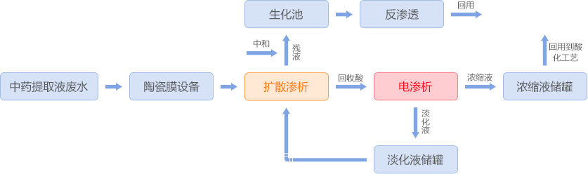 中藥提取液廢水經(jīng)陶瓷膜過濾后進入擴散滲析器處理,擴散滲析殘液外排至生化處理系統(tǒng)進行生化處理,生化達標水經(jīng)反滲透過濾產(chǎn)生純水回用;擴散滲析回收酸(硫酸含量約3%)進入均相膜電滲析器濃縮淡化,淡水可作為擴散滲析接收液回用,濃水濃縮至硫酸含量9%以上回用到中藥提取液生產(chǎn)工藝。通過膜集成技術配合傳統(tǒng)生化工藝,使該中藥提取液廢水得以資源化利用。