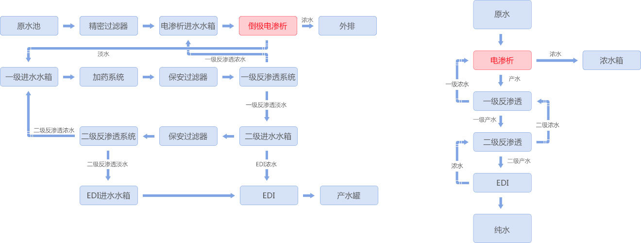 熱電廠反滲透濃水經(jīng)電滲析處理到鍋爐用水標準。反滲透濃水電導率3700μS/cm,水量150m³/h,經(jīng)電滲析處理后,電滲析濃水出水26m³/h,含鹽量11118mg/L。進一步,電滲析淡水進入反滲透系統(tǒng),反滲透淡水進一步經(jīng)EDI處理為鍋爐用水,EDI產(chǎn)水電導率≤0.2μS/cm,pH值7±1。