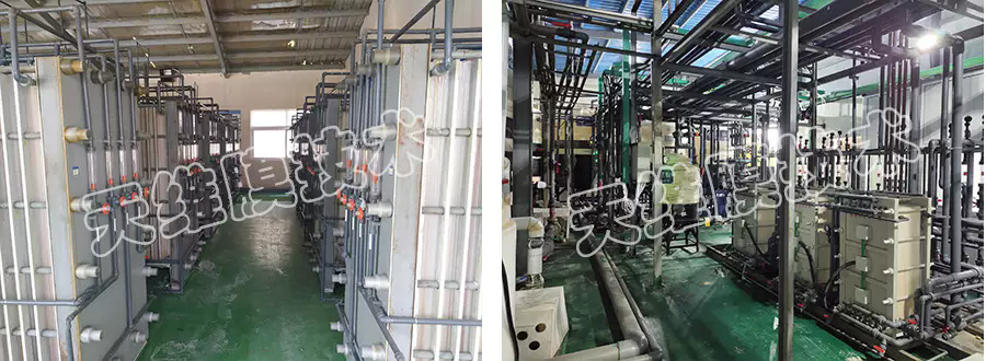 電鍍廢水由于其水質復雜,各類重金屬、COD含量較高,一直是膜濃縮工藝中的難點,采用均相膜電滲析裝置有效的解決了此問題,原水經(jīng)沉降、氧化、超濾預處理后進入電滲析濃縮, 達到12%后進入MVR蒸發(fā),淡水經(jīng)反滲透處理后回用,電鍍廢水得到有效處理,達到近零排放。